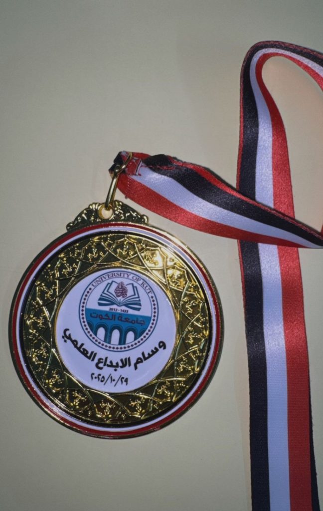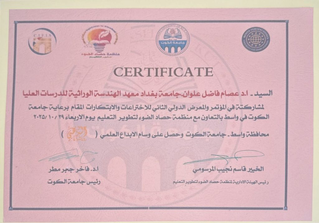 وقد نالت البراءة الوسام الذهبي للابداع العلمي وشهادة التقديرية مقدمة من قبل رئيس جامعة الكوت والسيد رئيس الهيئة الادارية لمنظمة حصاد الضوء لتطوير التعليم.